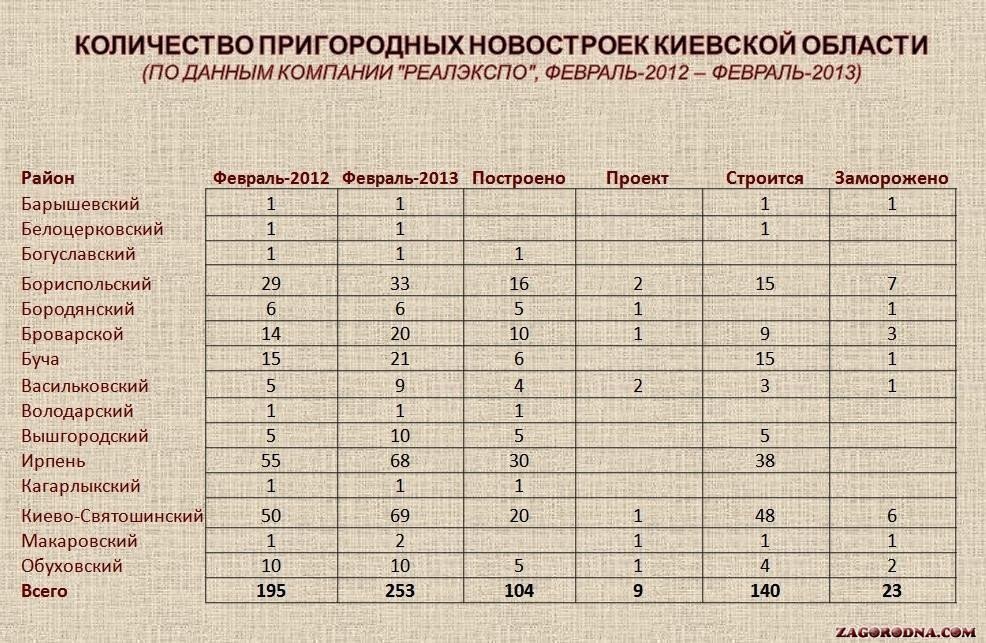 По словам директора компании Виктора Коваленко, «по состоянию на 1 марта 2013 года лидером среди 15 районов Киевской области по количеству новостроек является Киево-Святошинский район с 69 новостройками в сравнении с 50 объектами в начале 2012 года. За год на рынок вышло 19 объектов, что в процентном соотношении составило 38% .