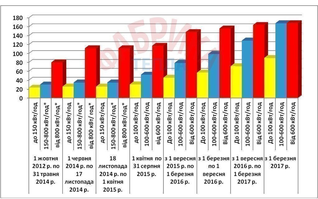 Електричне опалення будинку завжди поступалося іншим видам опалення. Основна причина – висока вартість електроенергії. Навіть при старих цінах на природний газ опалення будинку за допомогою електрокотла було в 2-3 рази дорожче від використання аналогічного газового котла. За останні роки середня ціна 1 кВт електричної енергії виросла в 4 рази. Також на найближчий рік заплановано ще два підвищення тарифів. Динаміка зростання тарифів на електроенергію зображена на рис. 3.
