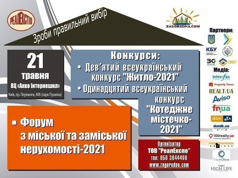 Консалтингова компанія «РеалЕкспо» та портал www.zagorodna.com за підтримки Комітету з питань організації державної влади, місцевого самоврядування, регіонального розвитку та містобудування Верховної Ради України; Міністерства розвитку громад та територій України; Конфедерації будівельників України; Земельної спілки України; Асоціації спеціалістів з нерухомості України; Спілки фахівців з нерухомого майна України проведе Всеукраїнський Форум «Міська та заміська нерухомість-2021» та Всеукраїнські незалежні Конкурси «ЖИТЛО-2021» та «КОТЕДЖНЕ МІСТЕЧКО-2021», які відбудуться 21 травня 2021 року у ВЦ "Акко Інтернешнл".